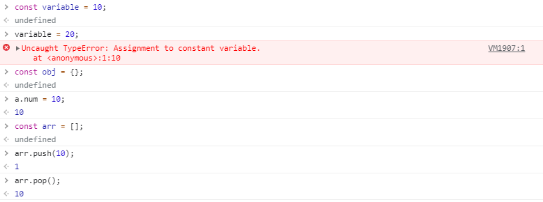 const는 한번 선언한 값에 대해서 변경할 수 없는 상수입니다. 하지만, 객체나 배열의 내부는 변경할 수 있습니다. 아래 코드의 obj 객체의 num이란 속성 추가가 가능하며, arr 배열에 요소를 추가(push)하거나 빼낼(pop) 수 있습니다.