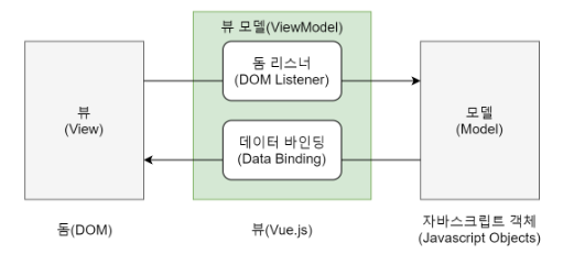 MVVM Pattern 용어 설명 뷰(View) 사용자에게 보이는 화면 돔(DOM) HTML 문서에 들어가는 요소(태그, 클래스, 속성 등)의 정보를 담고 있는 데이터 트리 돔 리스너(DOM Listener) 돔의 변경 내역에 대해 즉각적으로 반응하여 특정 로직을 수행하는 장치 모델(Model) 데이터를 담는 용기. 보통은 서버에서 가져온 데이터를 자바스크립트 객체 형태로 저장 데이터 바인딩(Data Binding) 뷰(View)에 표시되는 내용과 모델의 데이터를 동기화 뷰 모델(ViewModel) 뷰와 모델의 중간 영역. 돔 리스너와 데이터 바인딩을 제공하는 영역 2) 컴포넌트 기반 프레임워크