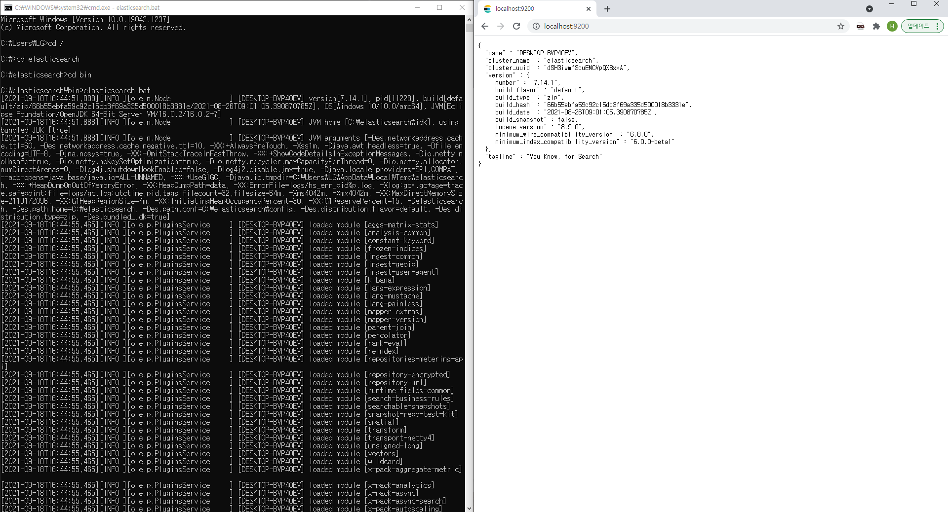 3) bin 폴더 내 elasticsearch.bat 실행엘라스틱서치 접속 : http://localhost:9200/ 콘솔 또는 명령 프롬프트 창에서 Ctrl + C를 눌러 프로세스 종료