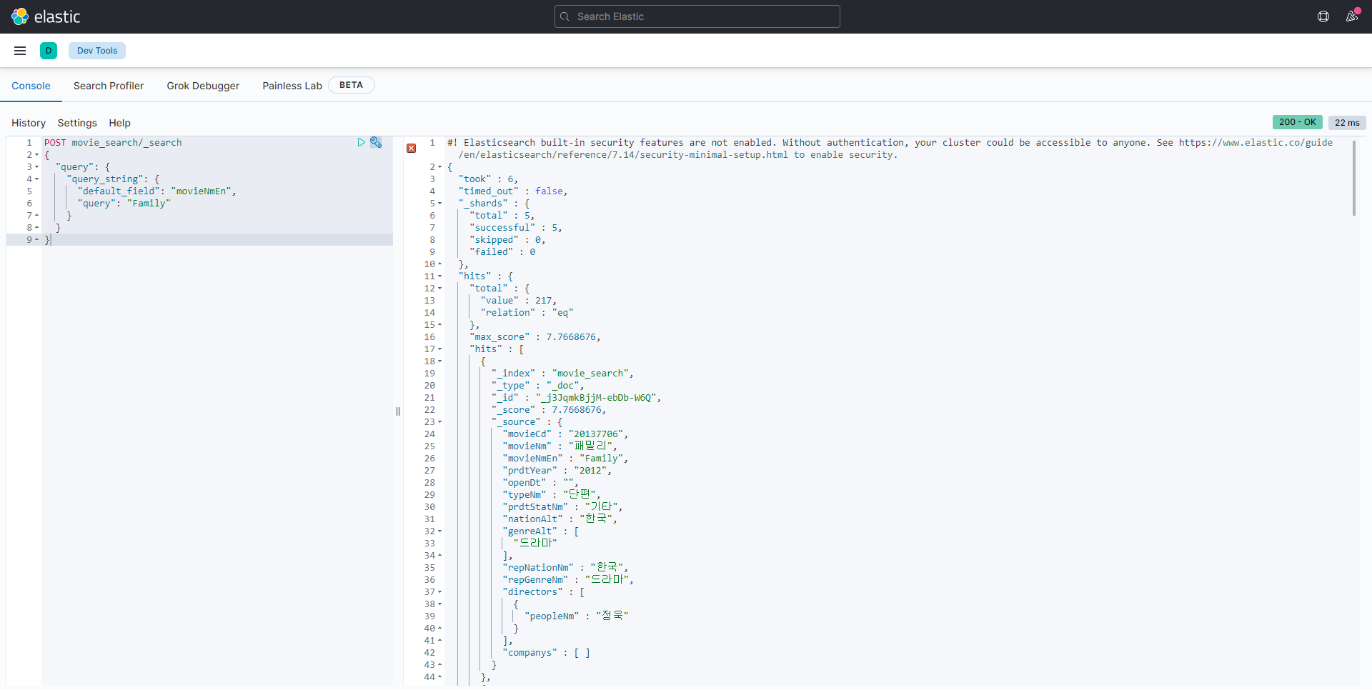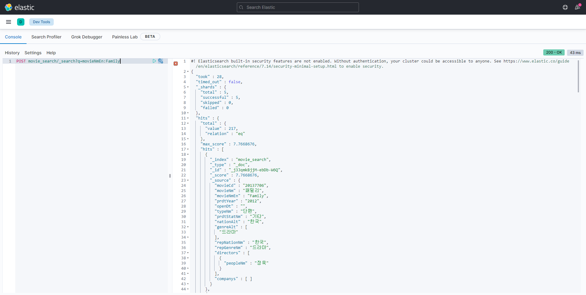 POST movie_search/_search { "query": { "query_string": { "default_field": "movieNmEn", "query": "Family" } } }