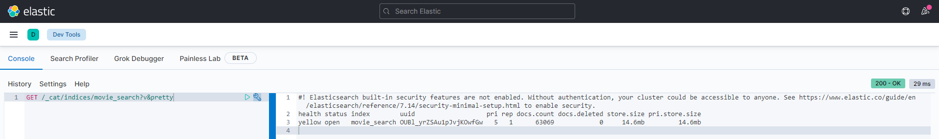 PS C:\Windows\System32> curl -XPOST 'http://localhost:9200/_snapshot/javacafe/movie-search/_restore' {"accepted":true}kibana에서 movie_search 인덱스가 생성되었는지 확인할 수 있습니다.
