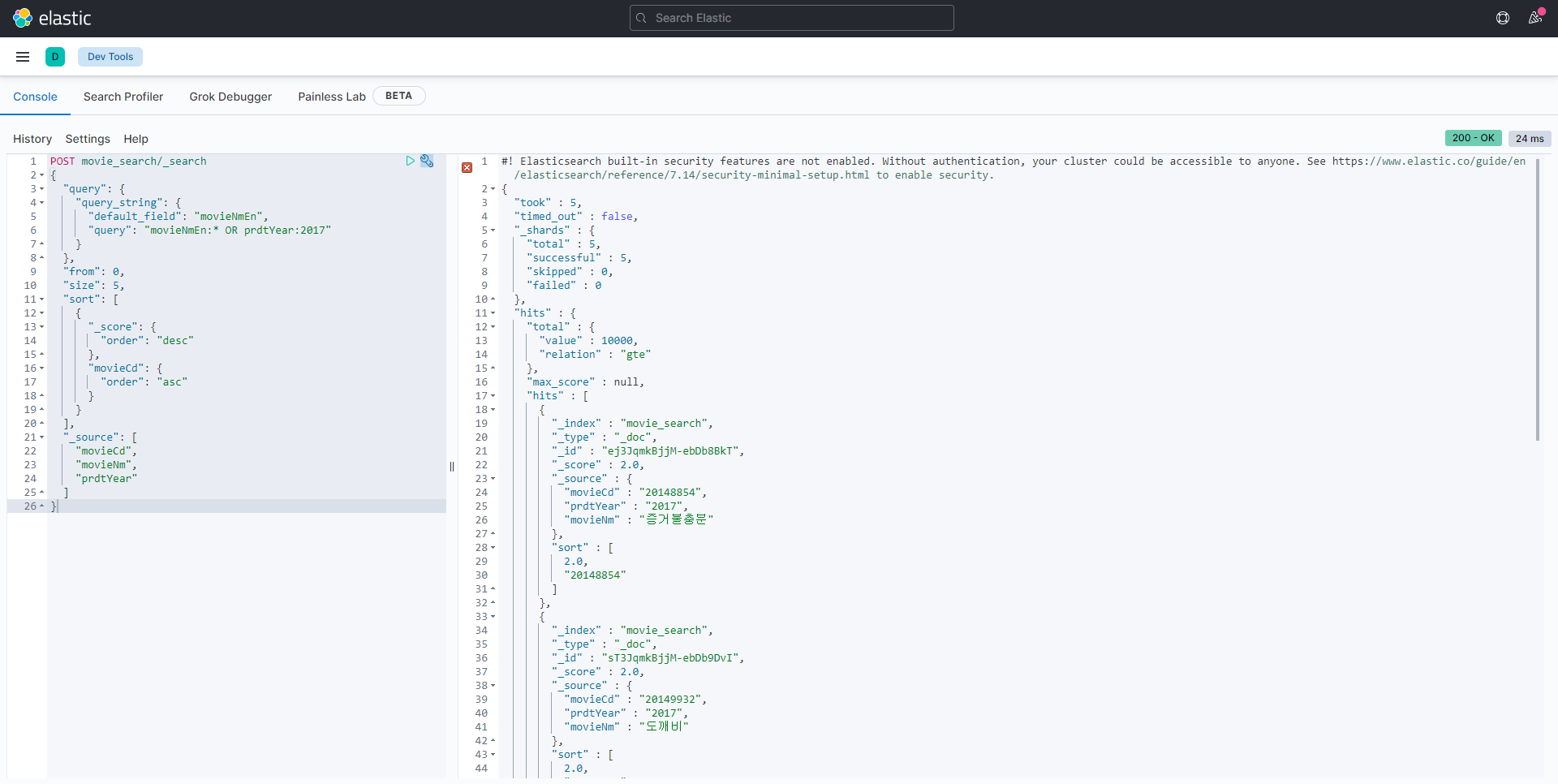 POST movie_search/_search { "query": { "query_string": { "default_field": "movieNmEn", "query": "movieNmEn:* OR prdtYear:2017" } }, "from": 0, "size": 5, "sort": [ { "_score": { "order": "desc" }, "movieCd": { "order": "asc" } } ], "_source": [ "movieCd", "movieNm", "prdtYear" ] }