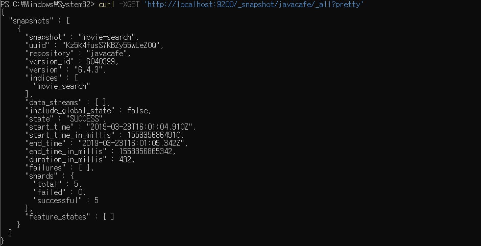 PS C:\Windows\System32> curl -XPUT "http://localhost:9200/_snapshot/javacafe" -H "Content-Type: application/json" -d ' { >> \"type\": \"fs\", >> \"settings\": { >> \"location\": \"C:\\elasticsearch\\snapshot\\book_backup\\search_example\", >> \"compress\": true >> } >> }' {"acknowledged":true}> Window의 경우, 데이터(-d) 내부 double-quote(") 앞에 백슬러시(\)를 추가로 붙여주어야 합니다.