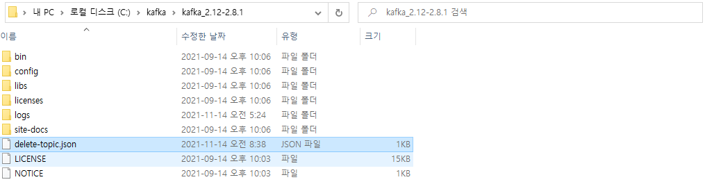삭제하고자 하는 데이터에 대한 정보를 파일로 저장해서 사용해야 합니다. delete-topic.json 파일을 설치 폴더에 생성합니다.