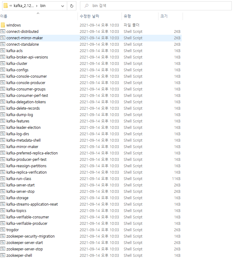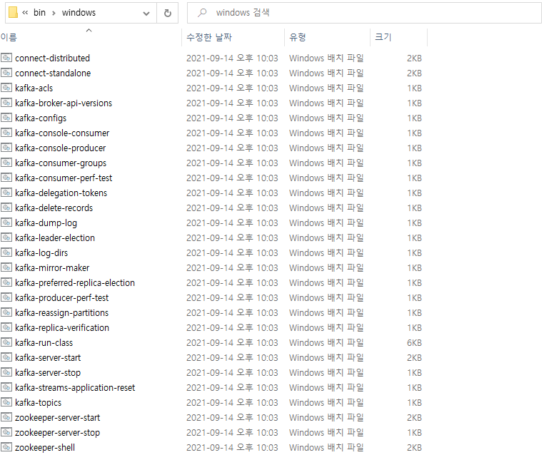 윈도우(windows) 환경에서 카프카 명령어 실행은 설치폴더\bin\windows 하위의 bat 파일을 사용하고, 맥(Mac) 환경에서 카프카 명령어 실행은 설치폴더\bin 하위의 sh 파일을 사용합니다.