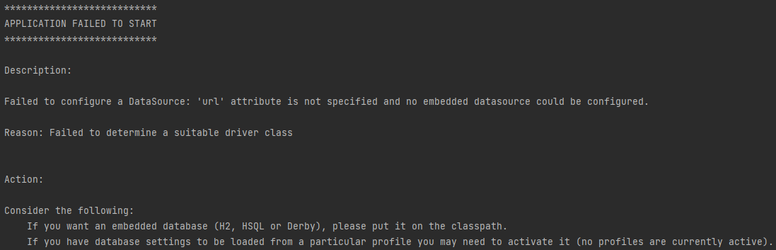 https://start.spring.io/ 의존성으로 H2 Databse를 추가하지 않으면 초기화 시 Failed to determine a suitable driver class 원인으로 아래와 같이 애플리케이션이 실행되지 않습니다.