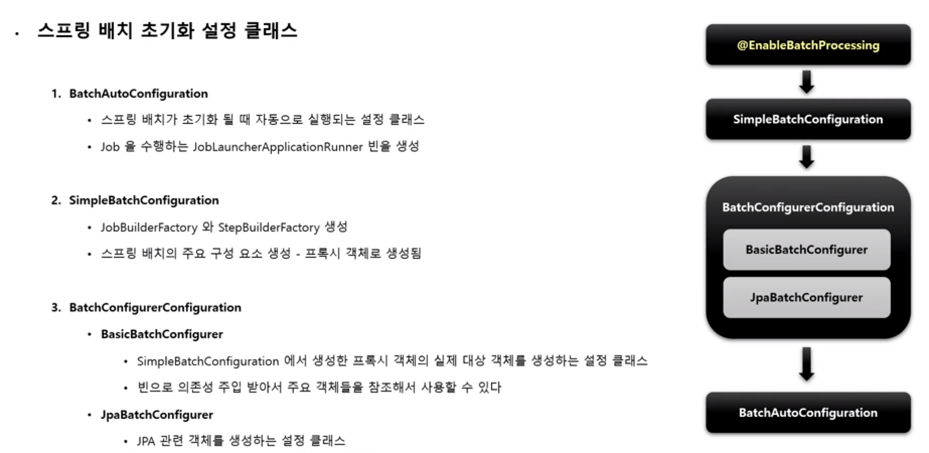 스프링 배치가 작동하기 위해 메인 함수가 있는 파일에 @EnableBatchProcessing 어노테이션을 선언합니다. @EnableBatchProcessing는 총 4개의 설정 클래스를 실행시키며 스프링 배치의 모든 초기화 및 실행을 구성합니다. 스프링 부트 배치의 자동 설정 클래스가 실행됨으로 빈으로 등록된 모든 Job을 검색해서 초기화와 동시에 Job을 수행하도록 구성됩니다.
