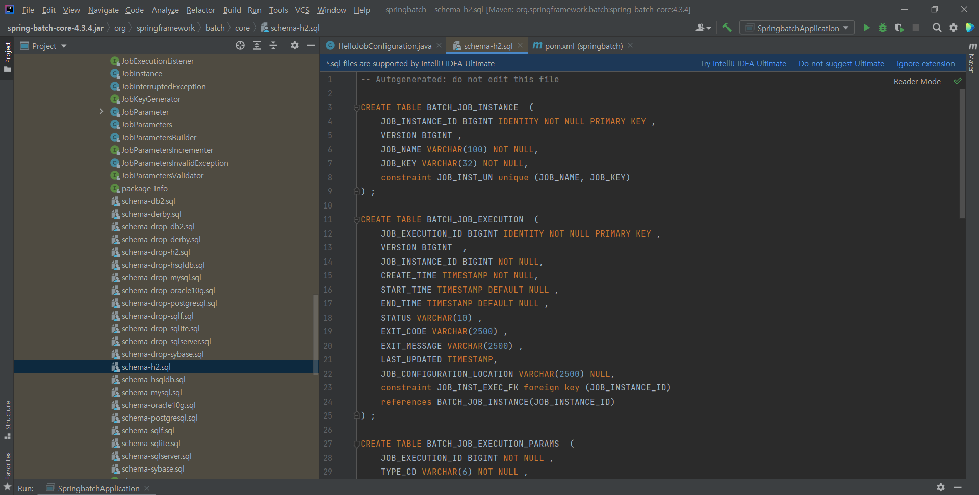데이터베이스 스키마를 제공하며 spring-bath-core 라이브러리 내 /org/springframework/batch/core 하위에 데이터베이스 유형별로 제공합니다. 아래는 h2 데이터베이스 스키마 파일입니다.