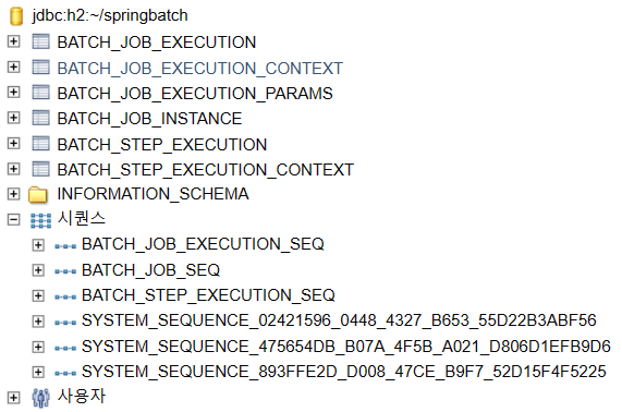 spring: profiles: active: local --- spring: config: activate: on-profile: local datasource: hikari: jdbc-url: jdbc:h2:tcp://localhost/~/springbatch;DB_CLOSE_DELAY=-1;DB_CLOSE_ON_EXIT=FALSE username: sa password: driver-class-name: org.h2.Driver batch: jdbc: initialize-schema: always --- spring: config: activate: on-profile: mysql datasource: hikari: jdbc-url: jdbc:mysql://localhost:3306/springbatch?useUnicode=true&characterEncoding=utf8 username: root password: 1234 driver-class-name: com.mysql.jdbc.Driver batch: jdbc: initialize-schema: always생성된 테이블 목록은 아래와 같습니다.