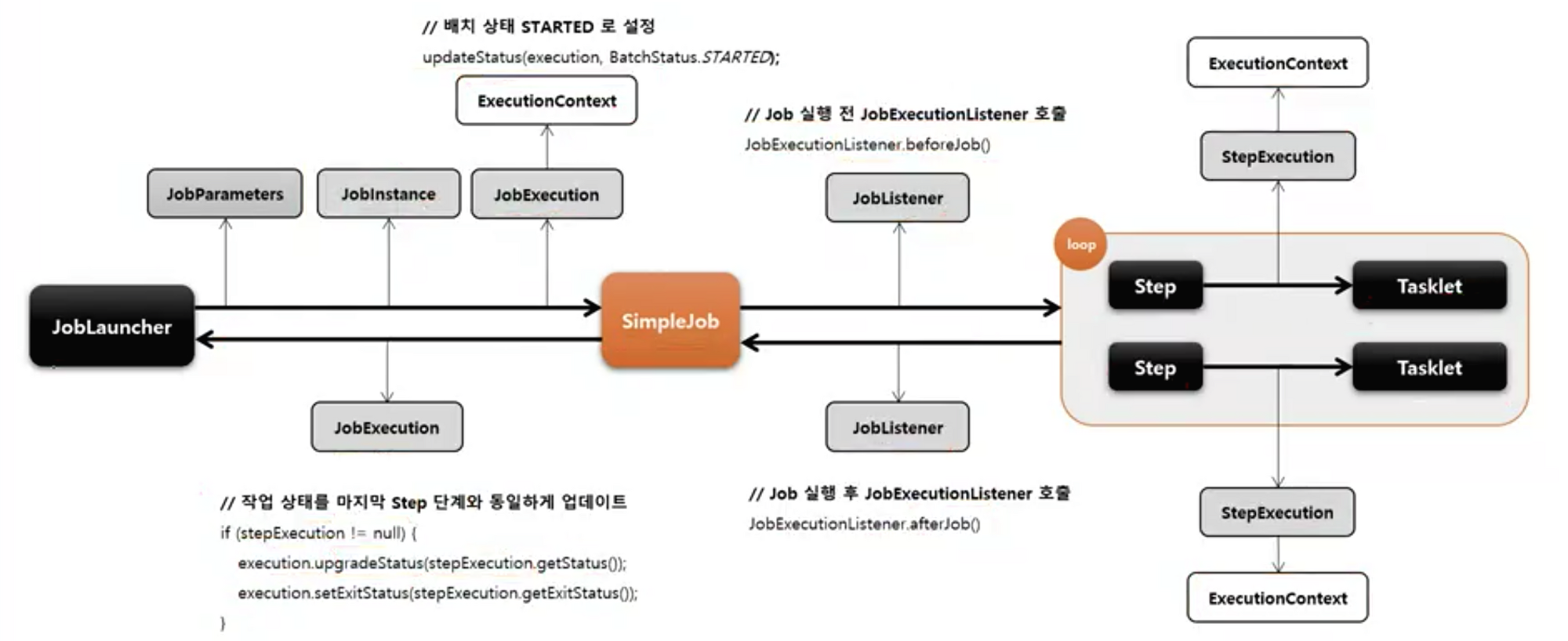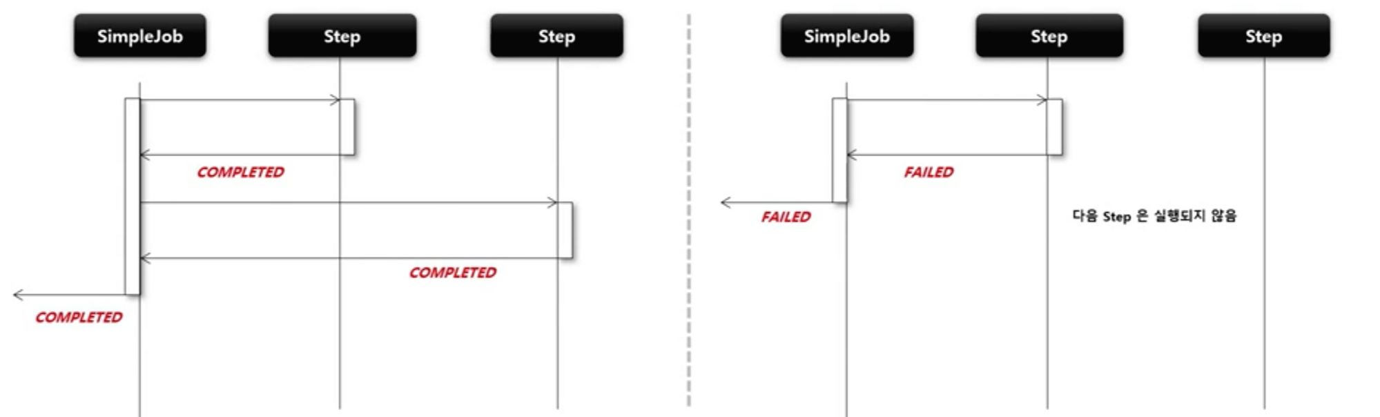 Step을 실행시키는 Job 구현체로 SimpleJobBuilder에 의해 생성됩니다. 여러 단계의 Step으로 구성할 수 있으며 Step을 순차적으로 실행시킵니다. 모든 Step의 실행이 성공적으로 완료되어야 Job이 성공적으로 완료되며, 맨 마지막에 실행한 Step의 BatchStatus가 Job의 최종 BatchStatus가 됩니다.