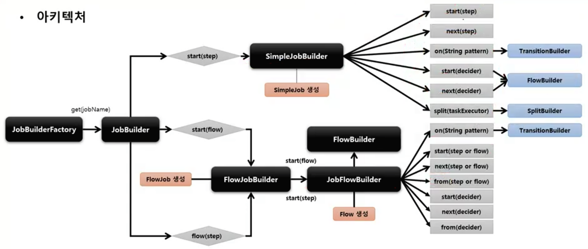 Architecture 스프링 배치는 Job과 Step을 쉽게 생성 및 설정할 수 있도록 util 성격의 빌더 클래스들을 제공합니다.