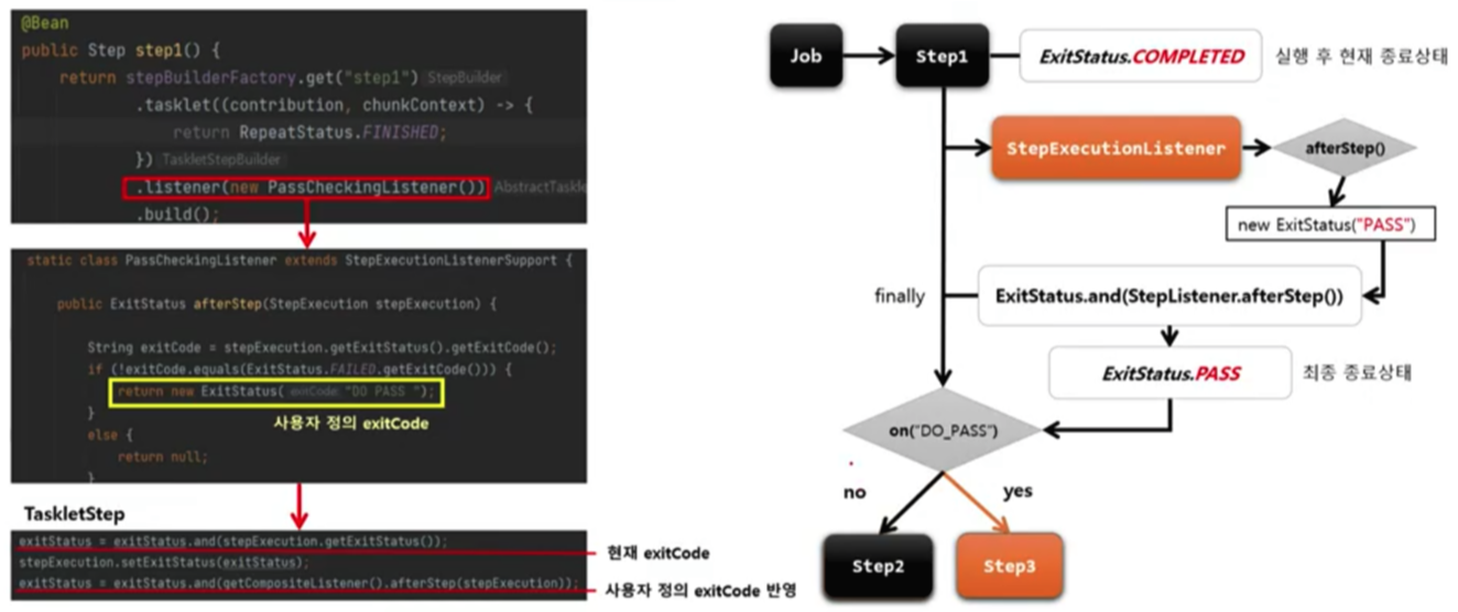 ExitStatus에 존재하지 않는 exitCode를 새롭게 정의해서 설정할 수 있습니다. StepExecutionListener의 afterStep() 메서드에서 Custom exitCode 생성 후 새로운 ExitStatus를 반환하면 됩니다.