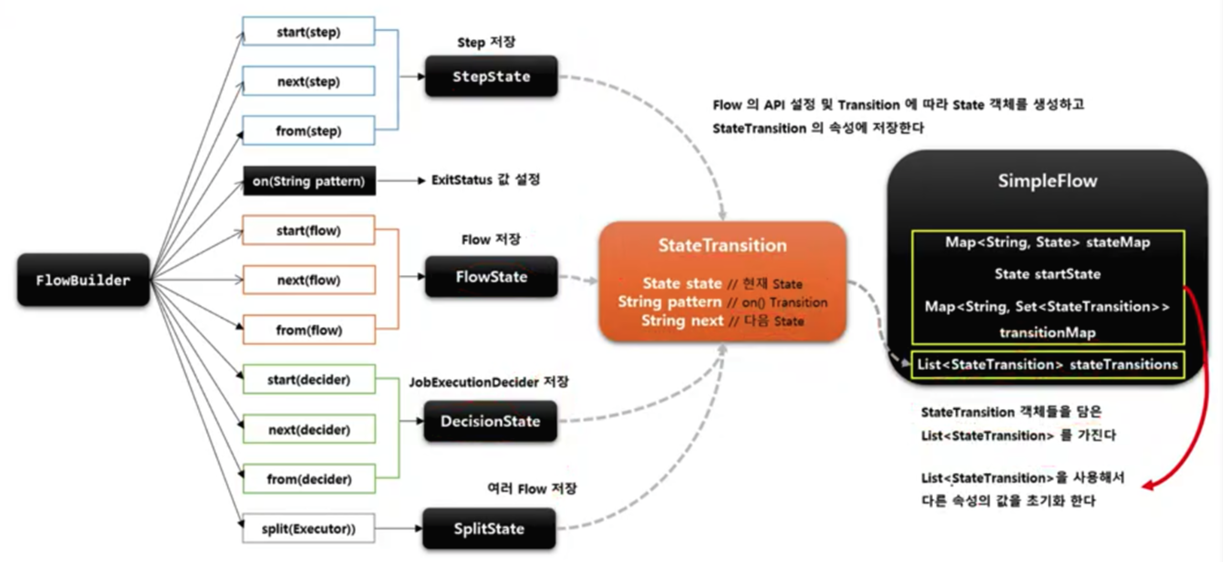 // JobBuilderFactory > JobBuilder > JobFlowBuilder > FlowBuilder > FlowJob public Job batchJob() { return jobBuilderFactory.get("batchJob") // 처음 실행 할 Step or Flow 설정 // Step: SimpleJobBuilder 반환 // Flow: JobFlowBuilder 반환 .start(Step or Flow or JobExecutionDecider) // Step의 실행 결과로 돌려 받는 종료상태(ExitStatus)를 매칭하는 패턴, TransitionBuilder 반환 // 예) .on("COMPLETED").to(step()) .on(String pattern) // 다음으로 실행할 단계 지정 .to(Step or Flow or JobExecutionDecider) // Flow를 중지 / 실패/ 종료하도록 Flow 종료 .stop() / fail() / end() / stopAndRestart(Step or Flow or JobExecutionDecider) // 이전 단계에서 정의한 Transition을 새롭게 추가 정의함 .from(Step or Flow or JobExecutionDecider) // 다음으로 이동할 단계 지정 .next(Step or Flow or JobExecutionDecider) // build() 앞에 위치하면 FlowBuilder를 종료하고 SimpleFlow 객체 생성 .end() // FlowJob 생성하고 flow 필드에 SimpleFlow 저장 .build(); }- .start() / .from() / .next(): Flow(흐름을 정의하는 역할)