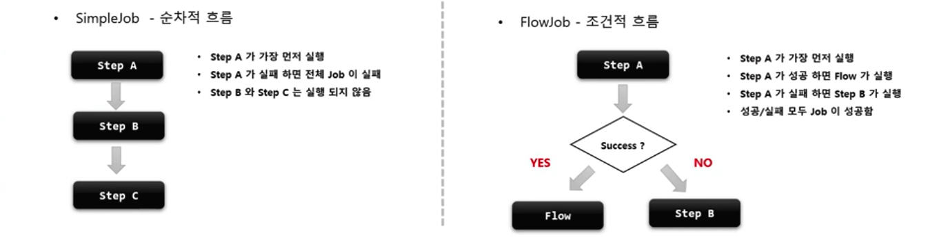 Step을 순차적으로만 구성하는 것이 아닌 특정한 상태에 따라 흐름을 전환하도록 구성할 수 있으며 FlowJobBuilder에 의해 생성됩니다. Flow와 Job의 흐름을 구성하는데만 관여하고 실제 비즈니스 로직은 Step에서 이루어집니다. 내부적으로 SimpleFlow 객체를 포함하고 있으며 Job 실행 시 호출됩니다. 아래와 같은 케이스에 사용합니다.