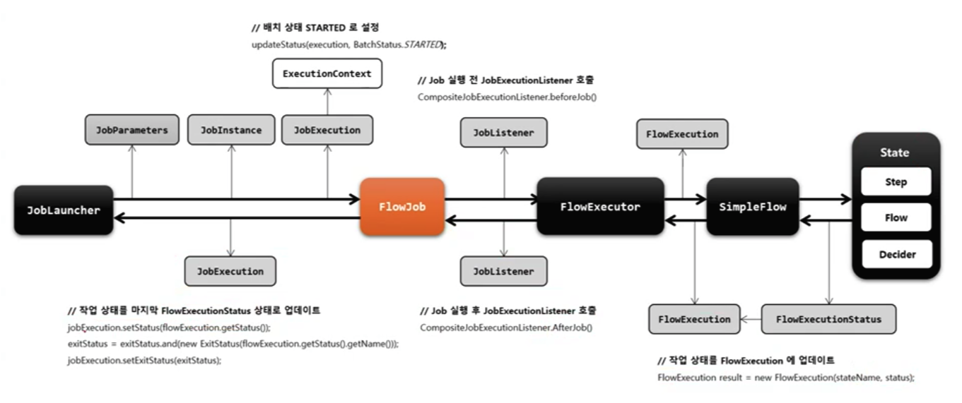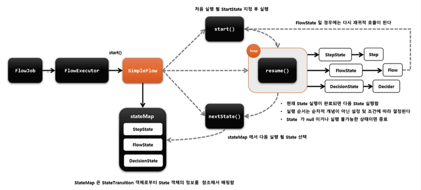 스프링 배치에서 제공하는 Flow의 구현체로서 각 요소(Step, Flow, JobExecutionDecider)들을 담고 있는 State를 실행시키는 도메인 객체입니다. FlowBuilder를 사용해서 생성하며 Transition과 조합하여 여러 개의 Flow 및 중첩 Flow를 만들어 Job을 구성할 수 있습니다.
