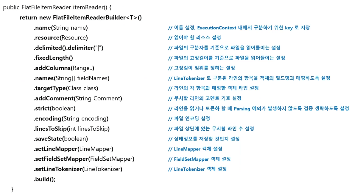 public FlatFileItemReader itemReader() { return new FlatFileItemReaderBuilder<Customer>() .name("flatFile") .resource(new ClassPathResource("customer.txt")) .fieldSetMapper(new BeanWrapperFieldSetMapper<>()) .targetType(Customer.class) .linesToSkip(1) .fixedLength() .strict(false) .addColumns(new Range(1,5)) .addColumns(new Range(6,9)) .addColumns(new Range(10,11)) .names("name","year","age") .build(); }[참고자료]