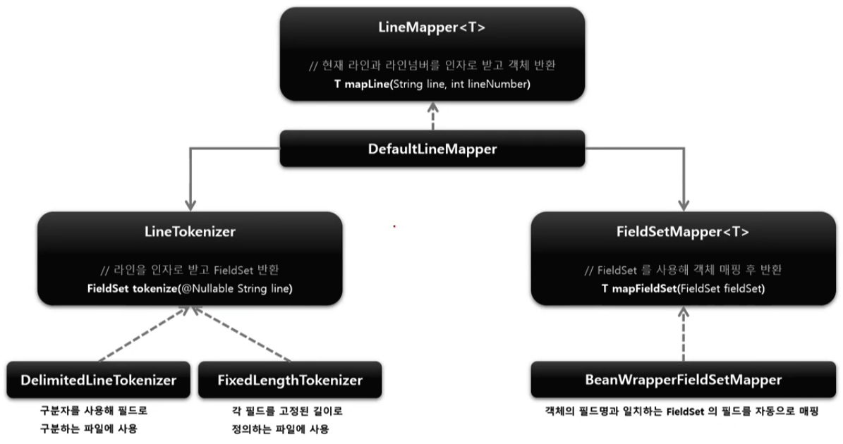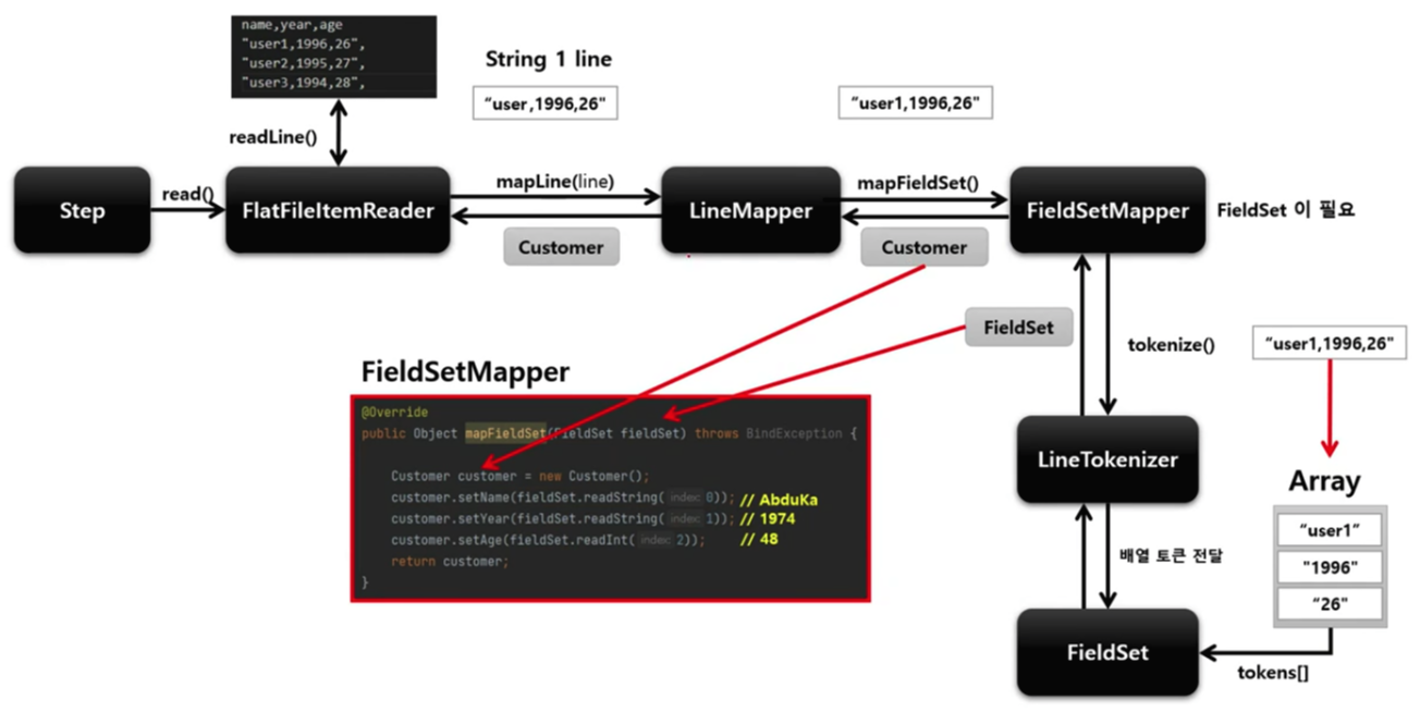 파일의 라인 한 줄을 Object로 변환해서 FlatFileItemReader로 리턴합니다. 단순히 문자열을 받기 때문에 문자열을 토큰화해서 객체로 매핑하는 과정이 필요하며, LineTokenizer와 FieldSetMapper를 사용해서 처리합니다.