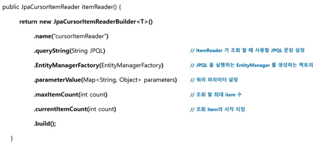 Cursor 기반의 JPA 구현체로서 EntityManagerFactory 객체가 필요하며 쿼리는 JPQL을 사용합니다. (Spring Batch 4.3버전부터 지원)