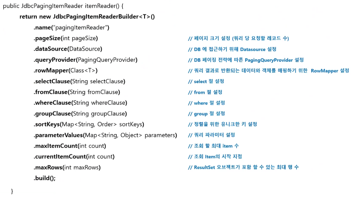 쿼리 실행에 필요한 쿼리문을 ItemReader에게 제공하는 클래스로 데이터베이스마다 페이징 전략이 다르기 때문에 각 데이터베이스 유형마다 다른 PagingQueryProvider를 사용합니다. 아래 API가 해당되며 select, from, sortKey 절은 필수로 설정해야 하며 where, group by 절은 필수가 아닙니다.
