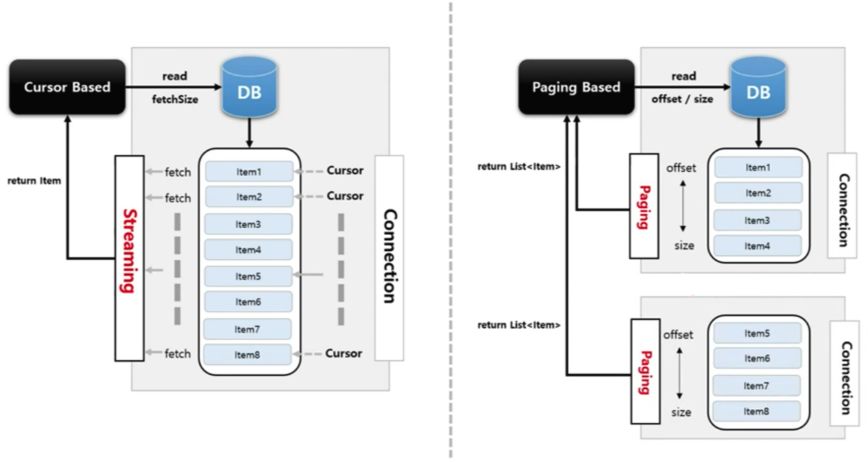 배치 애플리케이션은 실시간적 처리가 어려운 대용량 데이터를 다루며 이 때 DB I/O의 성능문제와 메모리 자원의 효율성 문제를 해결할 수 있어야 합니다. 스프링 배치에서는 대용량 데이터 처리를 위해 Cusor Based / Paging Based 두 가지 처리 방식을 제시하고 있습니다.