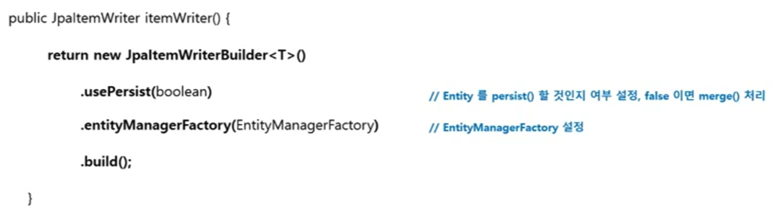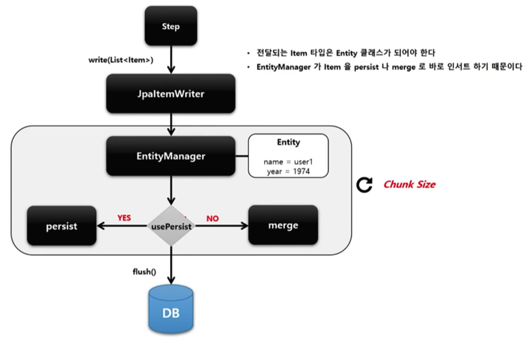 Architecture JPA Entity 기반으로 데이터를 처리하며 EntityManagerFactory를 주입받아 사용합니다. Entity를 하나씩 chunk 크기 만큼 insert 혹은 merge한 다음 flush 합니다. ItemReader나 ItemProcessor로부터 아이템을 전달 받을 때는 Entity 클래스 타입으로 받아야 합니다.