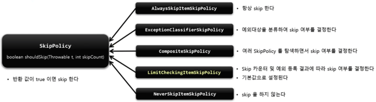 Skip 정책에 따라 아이템의 skip 여부를 판단하는 클래스입니다. 스프링 배치가 기본적으로 제공하는 SkipPolicy 구현체들이 있으며, 필요 시 직접 생성해서 사용할 수 있습니다. 내부적으로 Classfier 클래스들을 활용하고 있습니다.