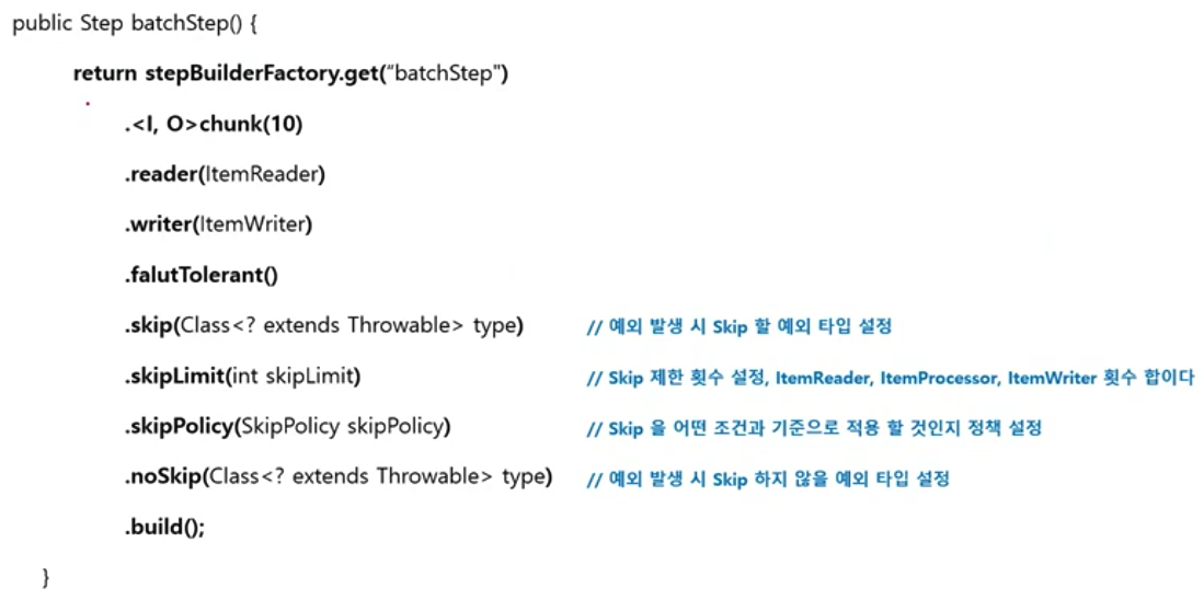 - ItemProcessor, ItemWriter: 예외가 발생하면 Chunk의 처음으로 돌아가서 스킵된 아이템을 제외한 나머지 아이템들을 가지고 처리
