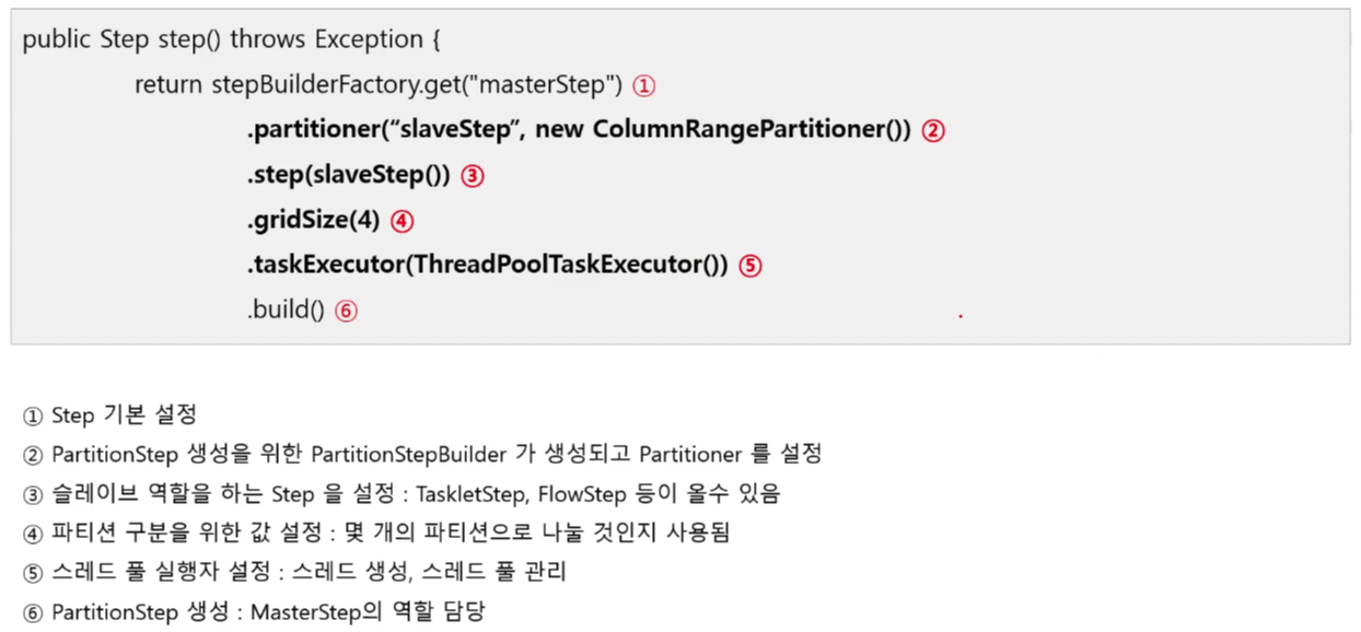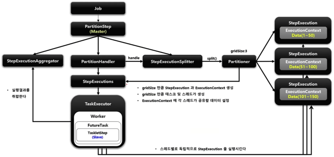 Master/Slave 방식으로 Master가 데이터를 파티셔닝 한 다음 각 파티션에게 스레드를 할당하여 Slave가 독립적으로 작동하는 방식입니다. MasterStep은 PartitionStep이며 SlaveStep은 TaskletStep, FlowStep 등이 올 수 있습니다. SlaveStep은 독립적인 StepExecution 파라미터 환경을 구성하며, ItemReader / ItemProcessor / ItemWriter 등을 가지고 작업을 독립적으로 병렬 처리합니다.