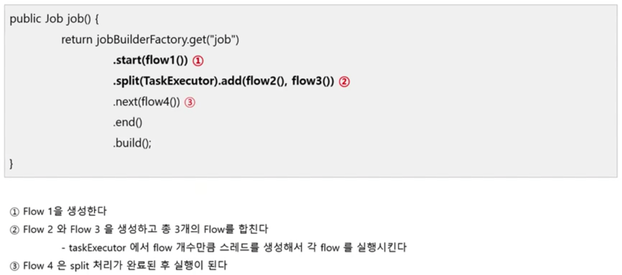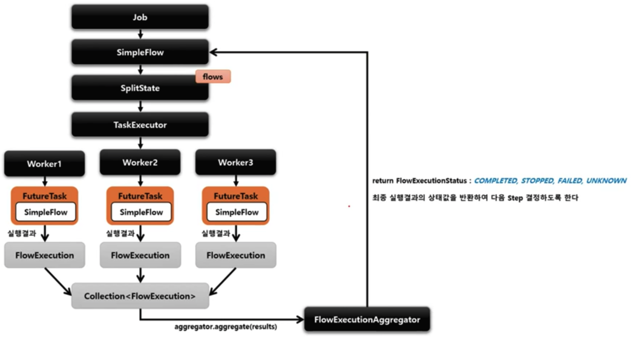 Step마다 스레드가 할당되어 여러개의 Step을 병렬로 실행하는 방식으로 SplitState를 사용해서 여러 개의 Flow들을 병렬적으로 실행하는 구조입니다. 실행이 다 완료된 후에는 FlowExecutionStatus 결과들을 취합해서 다음 단계를 결정합니다.