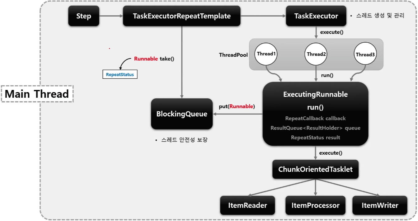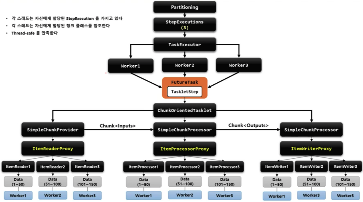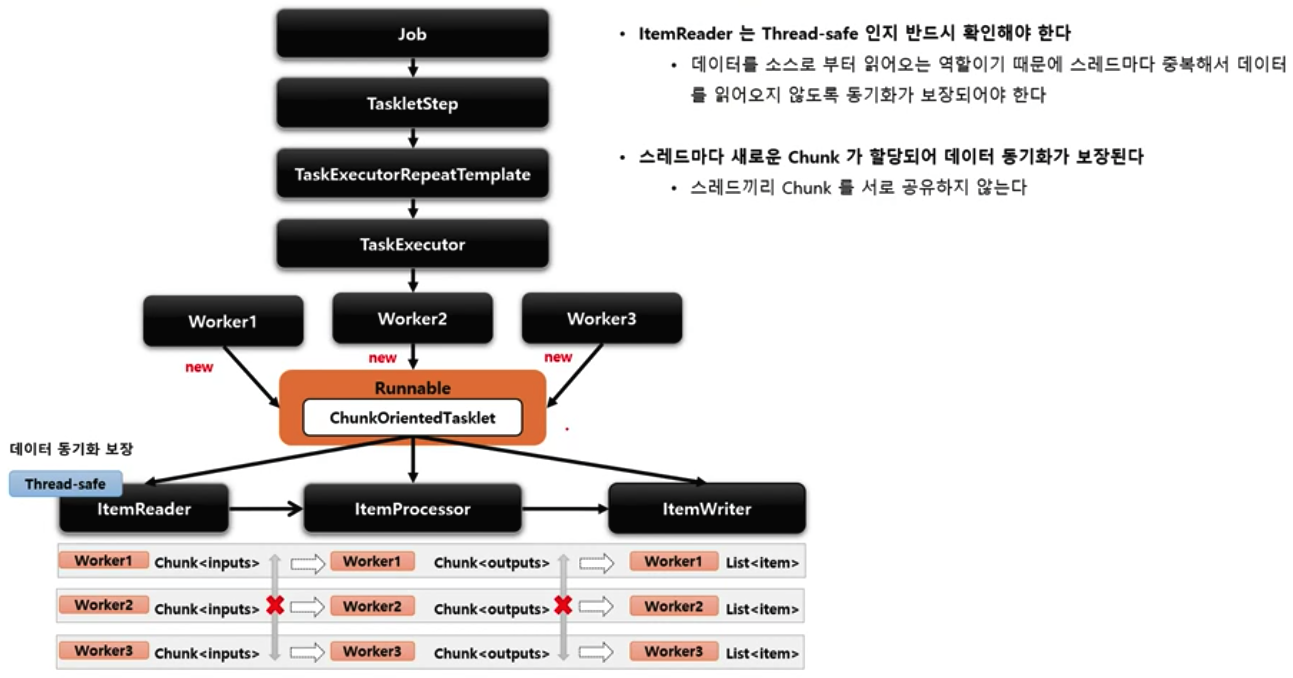 Step 내 Chunk 구조인 ItemReader, ItemProcessor, ItemWriter마다 여러 스레드가 할당되어 실행하는 방식입니다. TaskExecutorRepeatTemplate이 반복자로 사용되며 설정한 개수(throttleLimit) 만큼의 스레드를 생성하여 수행합니다. ItemReader 시 데이터를 중복으로 처리하지 않기 위해 Thread-safe인지 확인이 필요합니다. Thread-safe한 JdbcPagingItemReader, JpaPagingItemReader를 사용하며, TaskExecutor로 SimpleAsyncTaskExecutor를 지원하지만 ThreadPoolTaskExecutor 사용을 권장합니다. Thread-safe 하지 않은 ItemReader를 Thread-safe하게 처리하도록 하기 위해서는 SynchronizedItemStreamReader(Spring Batch 4.0부터 지원)를 사용합니다.