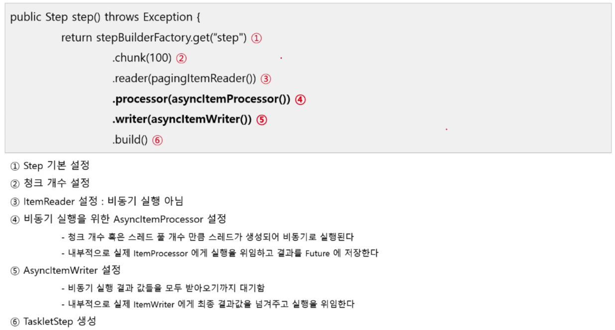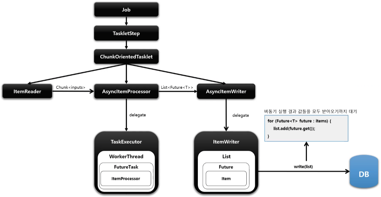ItemProcessor, ItemWriter에게 별도의 스레드가 할당되어 작업을 처리하는 방식입니다. Step 안에서 ItemProcessor가 비동기적으로 동작하는 구조로 AsyncItemProcessor와 AsyncItemWriter가 함께 구성되어야 합니다. AsyncItemProcessor로부터 AsyncItemWriter가 받는 최종 결과 값은 List<Future<T>> 타입이며, 비동기 실행이 완료될 때까지 대기합니다.