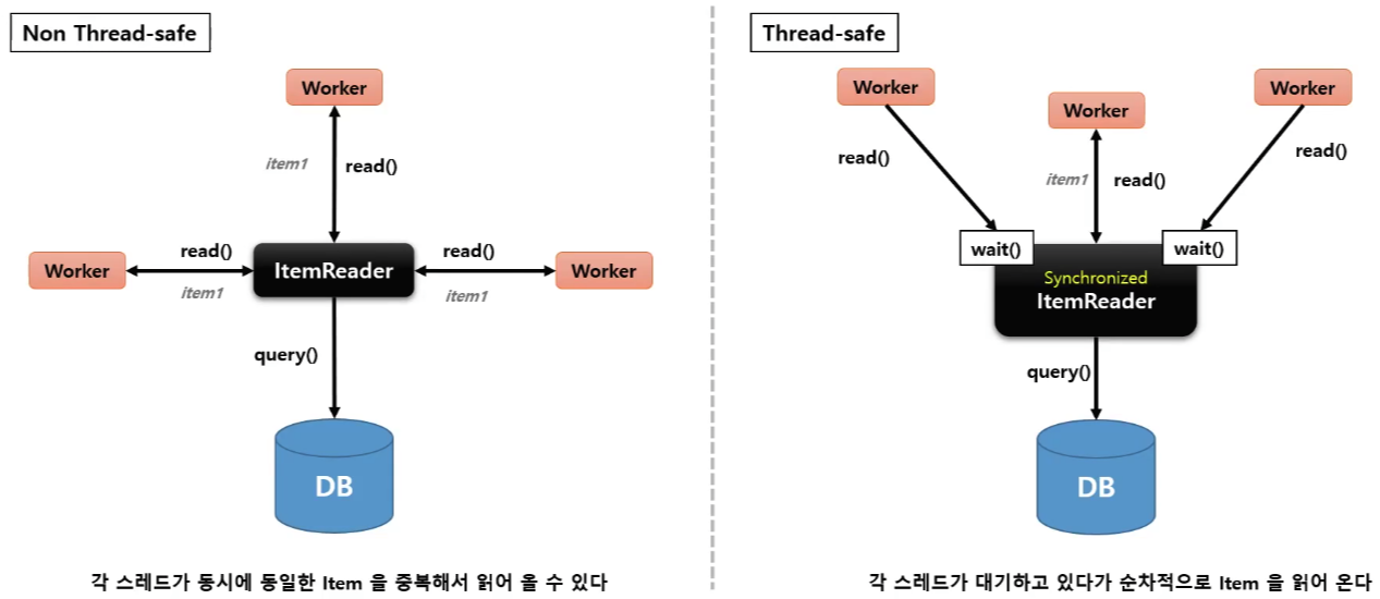 SynchronizedItemStreamReader는 Thread-safe 하지 않은 ItemReader를 Thread-safe하게 처리합니다.