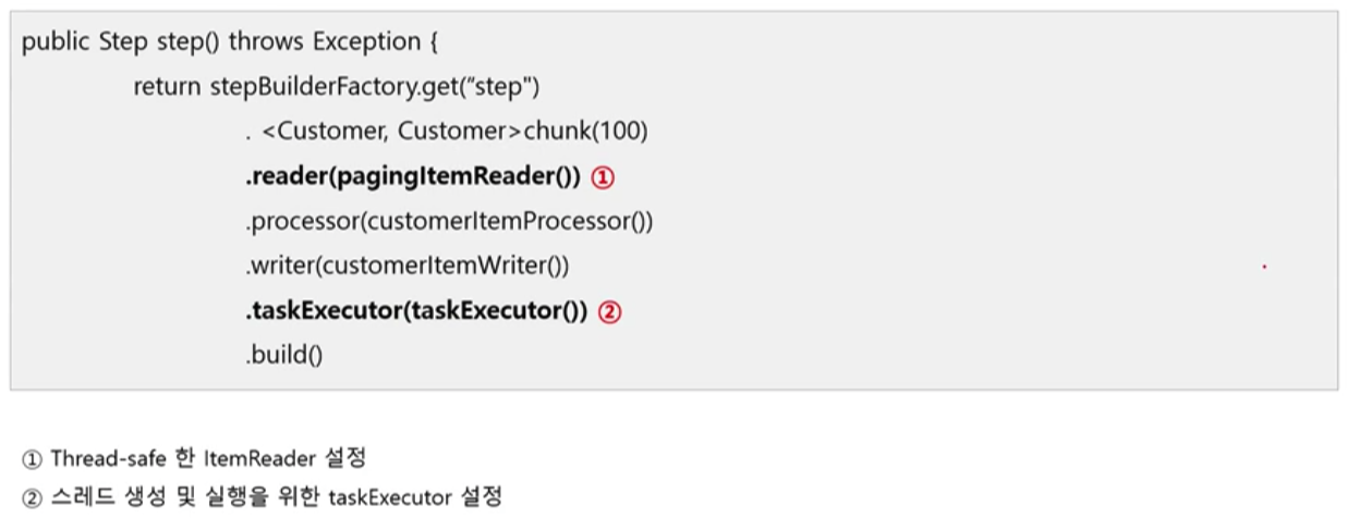 - 스프링 배치는 기본적으로 단일 스레드 방식으로 작업을 처리합니다.