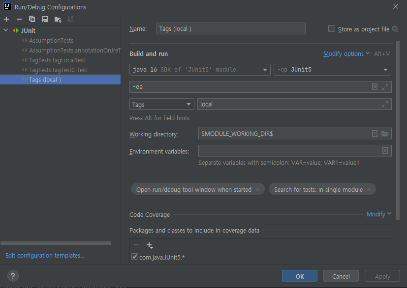 package com.java.JUnit5; import org.junit.jupiter.api.Tag; import org.junit.jupiter.api.Test; public class TagTests { @Test @Tag("local") void tagLocalTest() { System.out.println("local"); } @Test @Tag("testci") void tagTestCiTest() { System.out.println("testci"); } }IntelliJ에서 특정 태그로 필터링하여 실행할 수 있습니다. Run Configurations에서 Test kind를 Tags로 설정하고 Tag expression에 태그명을 기입합니다.