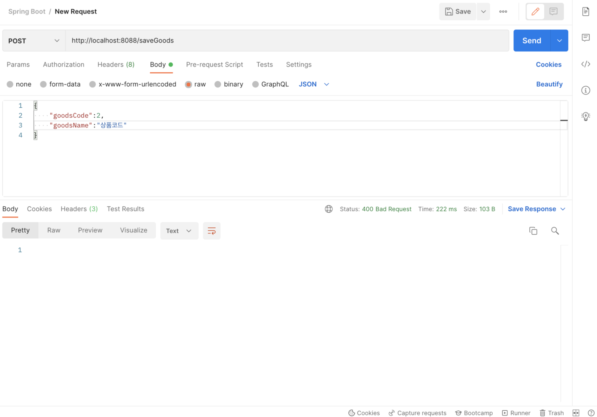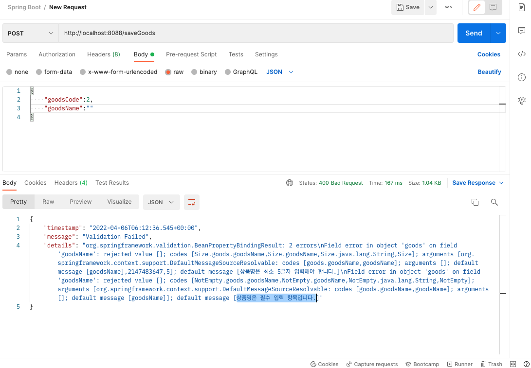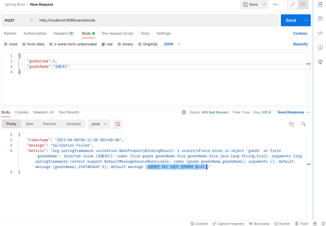 package com.spring.springboot; import com.spring.springboot.domain.Goods; import com.spring.springboot.exception.GoodsNotFoundException; import javax.validation.Valid; import org.springframework.web.bind.annotation.GetMapping; import org.springframework.web.bind.annotation.PathVariable; import org.springframework.web.bind.annotation.PostMapping; import org.springframework.web.bind.annotation.RequestBody; import org.springframework.web.bind.annotation.RestController; @RestController public class GoodsController { @GetMapping(path = "/goods/{goodsCode}") // endpoint public Goods findGoods(@PathVariable int goodsCode) throws Exception { /* 생략 */ } @PostMapping(path = "/saveGoods") // endpoint public void createGoods(@Valid @RequestBody Goods goods) throws Exception { /* save logic */ System.out.println("Save: " + goods.getGoodsName()); } }POST 요청을 위해 Postman을 사용합니다. Request 시 상품명을 4글자로 하고 호출을 하면 Status: 400 Bad Request 응답을 확인할 수 있습니다.