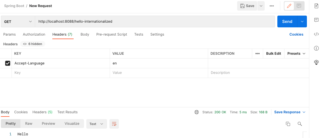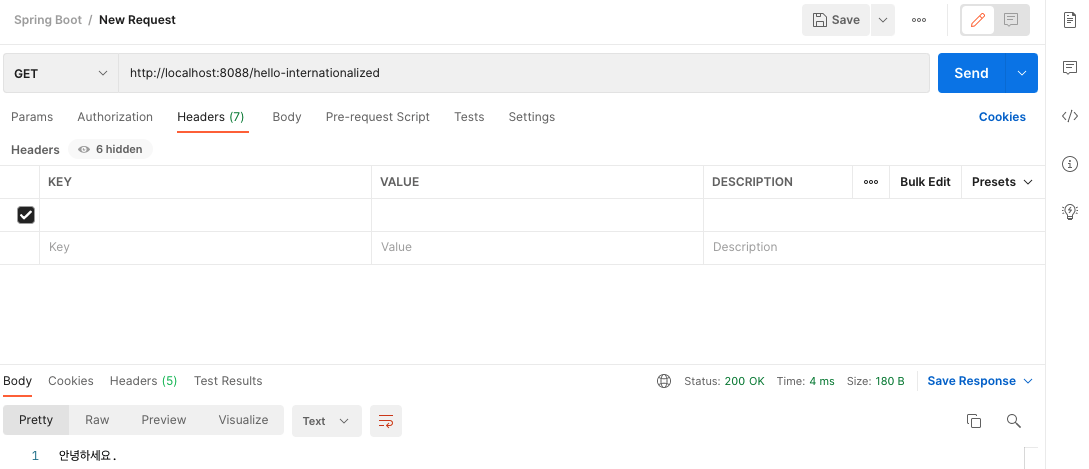 신규 /hello-internationalized API를 생성합니다. 요청 시 헤더 정보에 "Accept-Language"를 추가하고, MessageSource를 주입받아 message를 반환합니다.