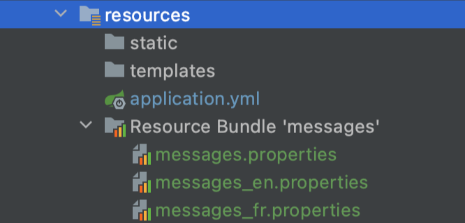 다음으로 application.yml 파일에 다국어 파일명을 지정하고 다국어 파일을 생성합니다. 다국어 파일은 resources 폴더 하위에 제공할 언어별로 생성합니다.