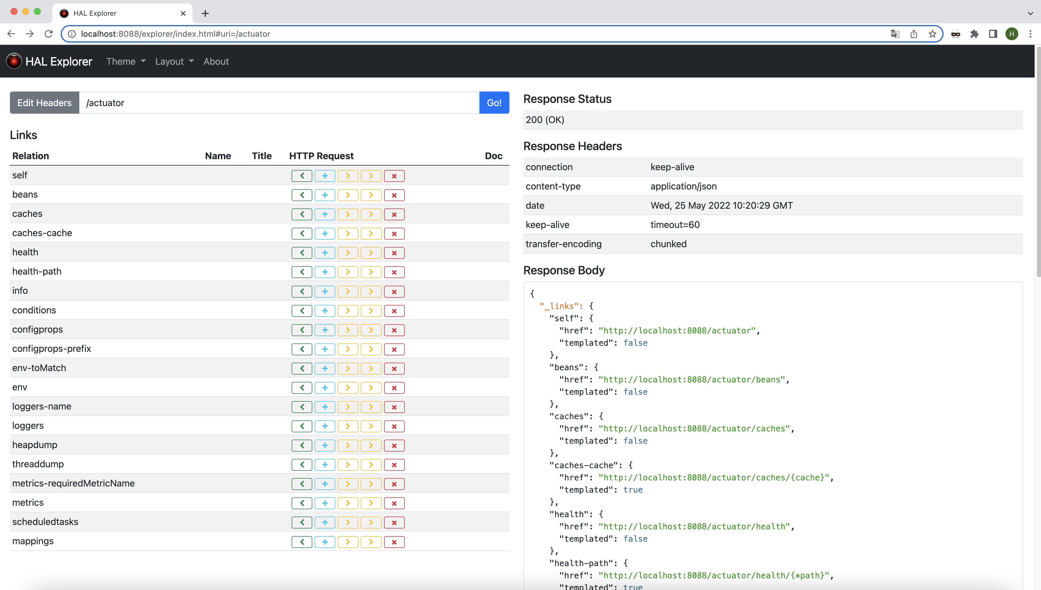 [Edit Headers] 부분에 이전 글에 작성한 /actuator을 입력하고 [Go!] 버튼을 클릭하면 좌측의 Links 부분과 우측의 Response Body를 확인할 수 있습니다.