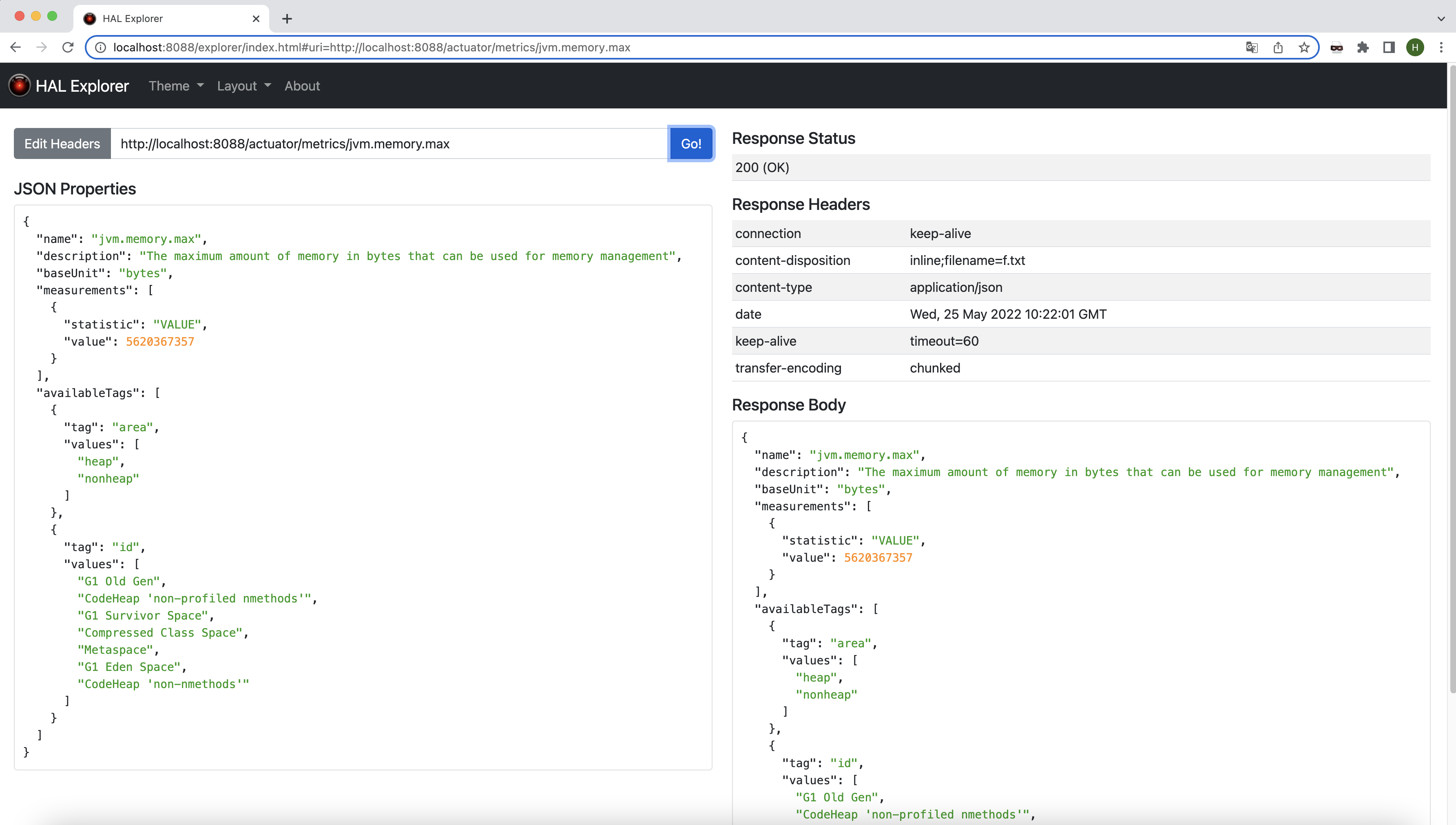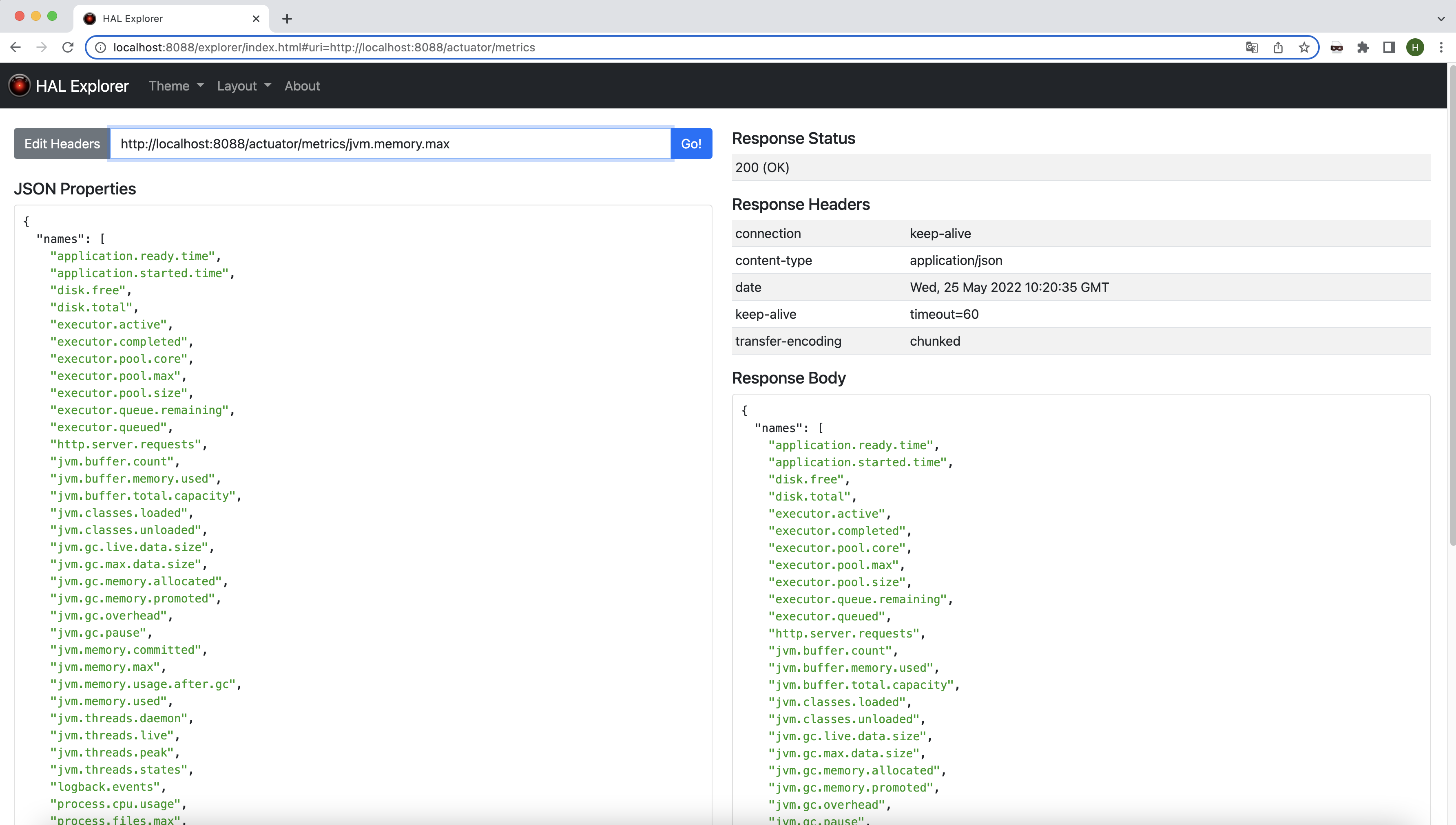 좌측 Links 하단 부분의 metrics [<] 클릭 시 JSON Properties가 출력됩니다. 출력된 속성 중 확인하고자 하는 속성을 [Edit Headers] 부분에 붙여 호출하면 결과를 확인할 수 있습니다.