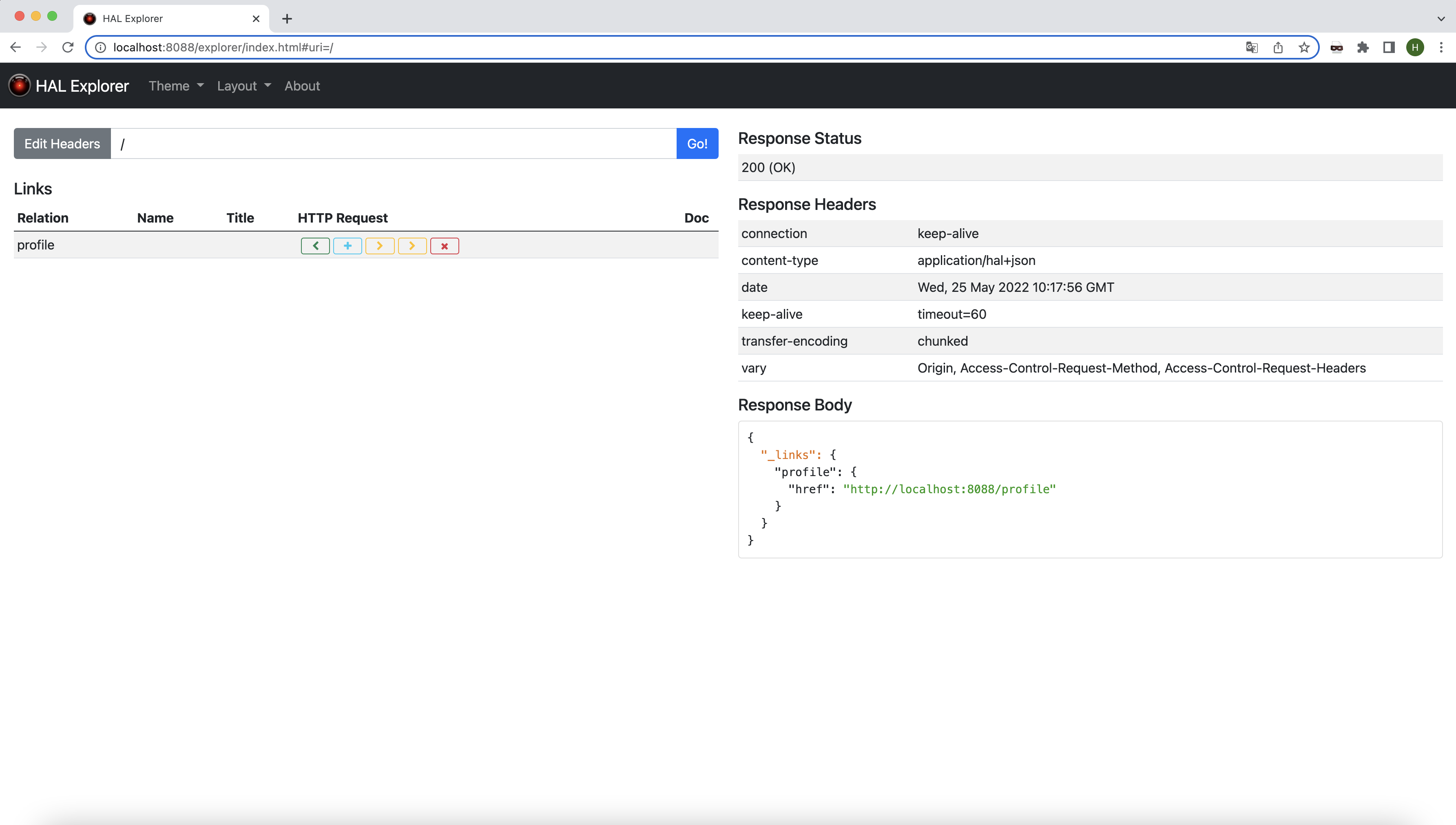 <dependency> <groupId>org.springframework.data</groupId> <artifactId>spring-data-rest-hal-explorer</artifactId> </dependency>의존성을 추가하고 서버를 기동한 후 http://localhost:8088/ 접속하면 아래와 같은 화면이 출력됩니다.