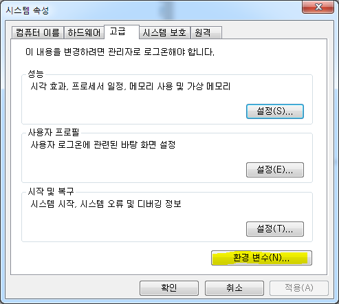 - 제어판\모든 제어판 항목\시스템 -> 고급 시스템 설정