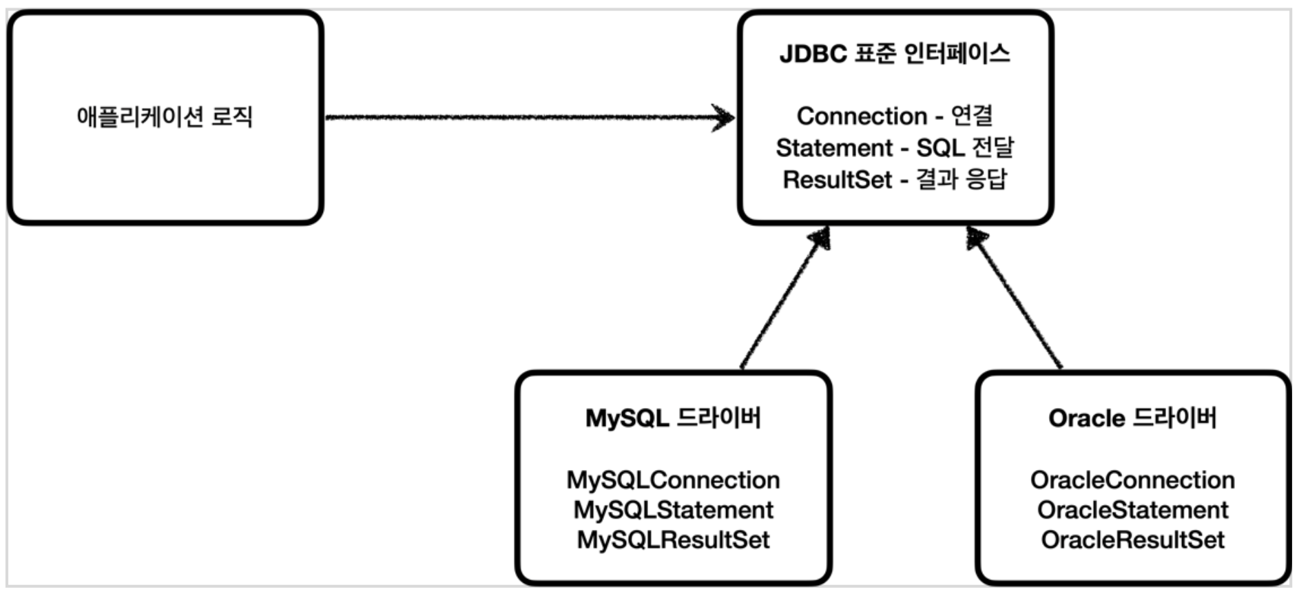 자바는 이렇게 표준 인터페이스를 정의하여 JDBC 드라이버를 통해 데이터베이스에 접근하게 하였습니다. JDBC 드라이버란 각각의 DB 벤더(회사)에서 자신의 DB에 맞도록 구현한 라이브러리 입니다(MySQL DB에 접근할 수 있는 것은 MySQL JDBC 드라이버, Oracle DB에 접근할 수 있는 것은 Oracle JDBC 드라이버). 데이터베이스 변경 시 JDBC 구현 라이브러리만 변경하면 됩니다. 개발자는 변경되는 데이터베이스의 커넥션 연결, SQL 전달, 그리고 결과를 응답 받는 방법을 새로 학습할 필요가 없으며, 애플리케이션 서버에 개발된 코드도 변경할 필요가 없습니다. 즉, JDBC 표준 인터페이스 사용법만 학습하면 수십개의 데이터베이스에 모두 적용할 수 있게 된 것입니다.