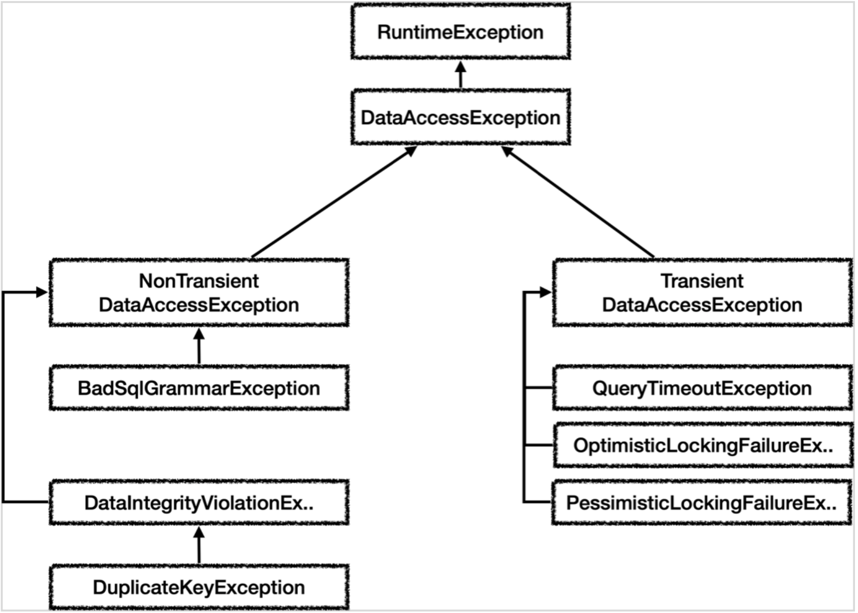 스프링은 데이터 접근 계층에 대한 수십 가지 예외를 정리해서 일관된 예외 계층을 제공합니다. 각각의 예외는 특정 기술에 종속적이지 않게 설계되어 있기에 서비스 계층에서도 스프링이 제공하는 예외를 사용하면 됩니다. JDBC나 JPA를 사용할 때 발생하는 예외를 스프링이 제공하는 예외로 변환해주는 역할도 스프링이 제공합니다. 아래 그림은 단순화 하기 위해 일부 계층을 생략한 버전입니다.