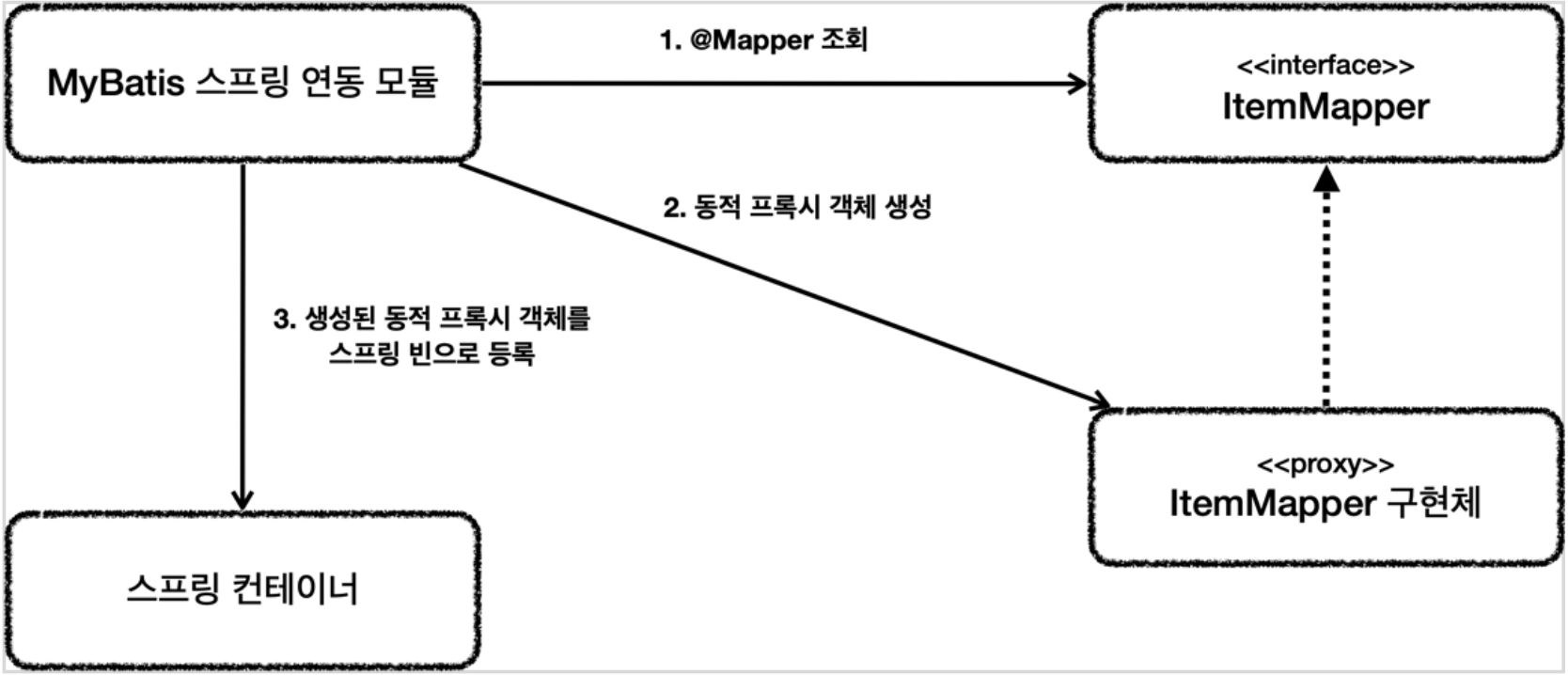- 해당 인터페이스가 발견되면 동적 프록시 기술을 사용해서 ItemMapper 인터페이스의 구현체를 만듭니다.