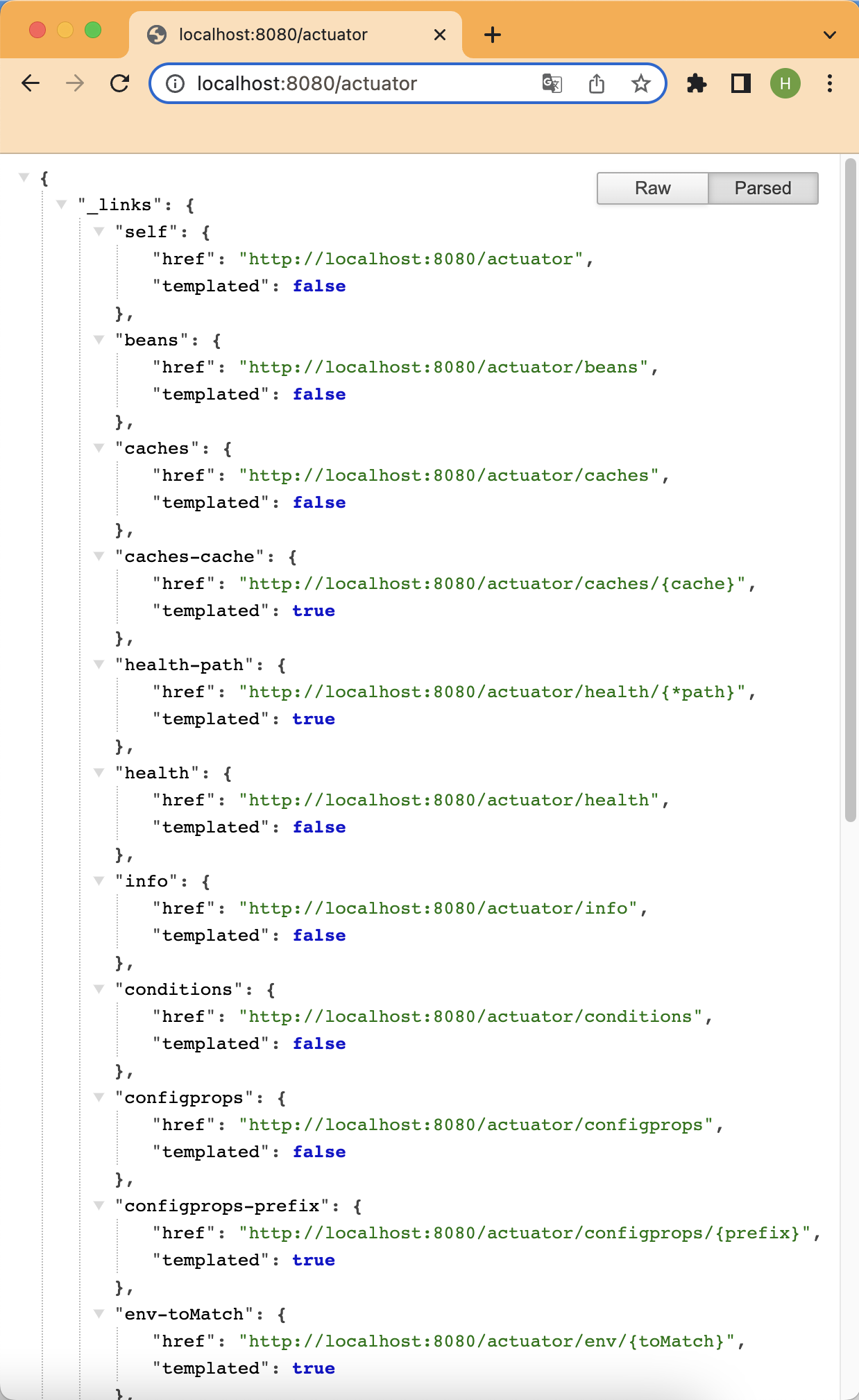 management: endpoints: web: exposure: include: "*"다시 실행해보면 액츄에이터가 제공하는 수 많은 기능들을 확인할 수 있습니다. 액츄에이터가 제공하는 기능 하나하나를 엔드포인트라고 합니다. 각각의 엔드포인트는 /actuator/{엔드포인트명} 과 같은 형식으로 접근할 수 있습니다.