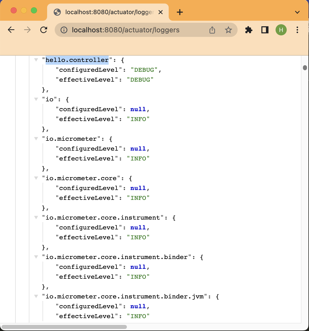 loggers 엔드포인트를 사용하면 로깅과 관련된 정보를 확인하고, 또 실시간으로 변경할 수 있습니다. 다음은 hello.controller 패키지와 그 하위는 debug 레벨을 출력하도록 하는 설정입니다. 로그를 별도로 설정하지 않으면 스프링 부트는 기본으로 INFO를 사용합니다.