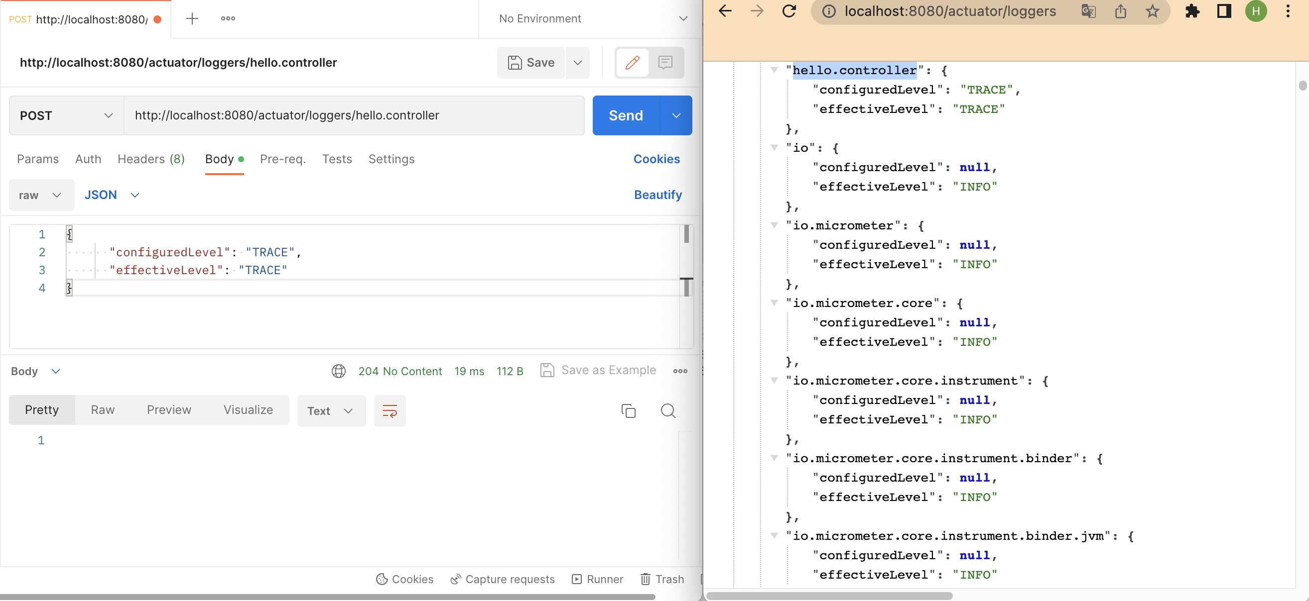 http://localhost:8080/log 실행 시 로그를 확인할 수 있고, http://localhost:8080/actuator/loggers/{로거이름} 으로 특정 로거 이름 기준으로 조회할 수 있습니다.