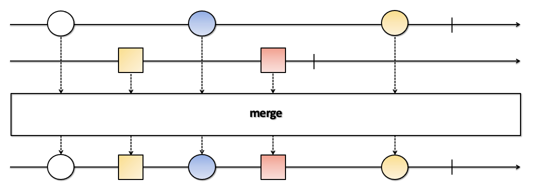 - 통지 시점이 빠른 Observable의 데이터부터 순차적으로 통지되고, 통지 시점이 같을 경우에는 merge() 함수의 파라미터로 먼저 지정된 Observable의 데이터부터 통지됩니다.