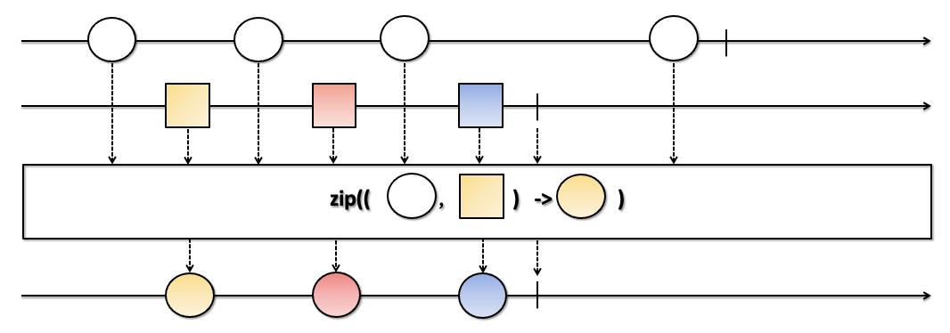 - 각 Observable에서 통지된 데이터가 모두 모이면 각 Observable에서 동일한 index의 데이터로 새로운 데이터를 생성한 후 통지합니다.