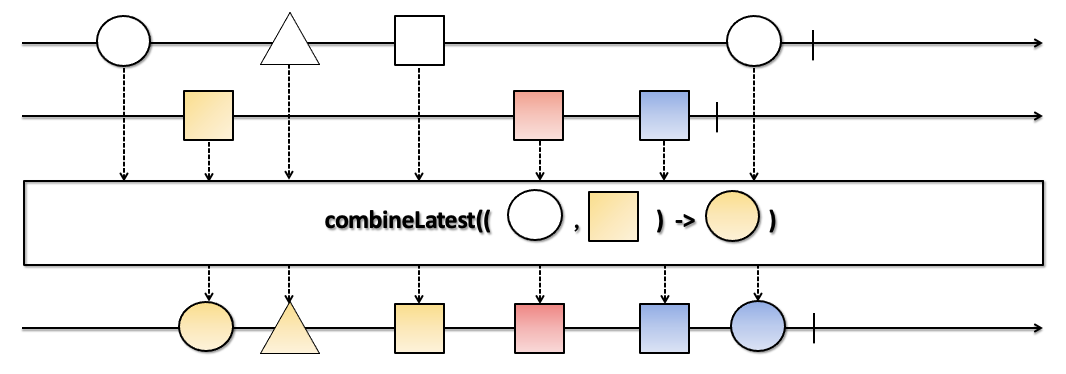 - 각 Observable에서 데이터를 통지할 때마다 모든 Observable에서 마지막으로 통지한 각 데이터를 함수형 인터페이스에 전달하고, 새로운 데이터를 생성하여 통지합니다.